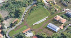 L’area dell’officina elettrica e dell’officina meccanica (con copertura curva) e la sistemazione del verde, della viabilità e degli spazi a parcheggio. Fotomontaggio- vista dall’alto.