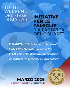 Domenica 1 Marzo – ore 10.10, ore 10.50, ore 15.30, ore 16.10 – “Macina, mescola e crea la tua opera d’arte con i colori della Miniera”. In abbinamento alla visita guidata nel percorso sotterraneo Galleria livello VII a bordo del trenino minerario e nel Museo Documentale “Torre dell’Orologio” , verrà proposto il laboratorio, per adulti e bambini : “La Fabbrica del Colore”. Nel nostro laboratorio “L’Arte incontra la terra” , tutti potranno trasformare i minerali veri in pigmenti spettacolari.